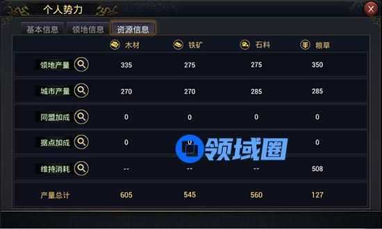 4)“资源信息”显示四大资源(木材、铁矿、石料、粮草)的生产情况,包括领地和城市产量、同盟和据点加成、维持消耗量等。通过资源产量的情况,玩家可以知道那些资源有余,那些资源紧缺,从而在扩张过程中有意地占据并争夺相关领地。