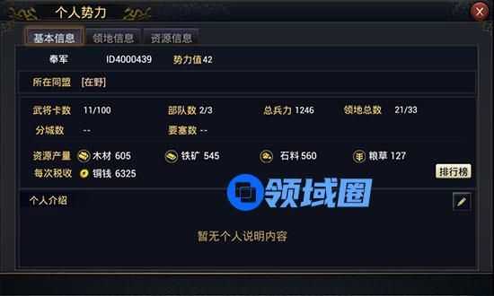 2)“基本信息”显示玩家的势力值,武将、部队、兵力、领地、分城、要塞的数量,以资源产量和税收收入,使玩家对自己的军事实力和资源产出一目了然。在最下方点击右侧编辑按钮还可修改自己独一无二的个人介绍。
