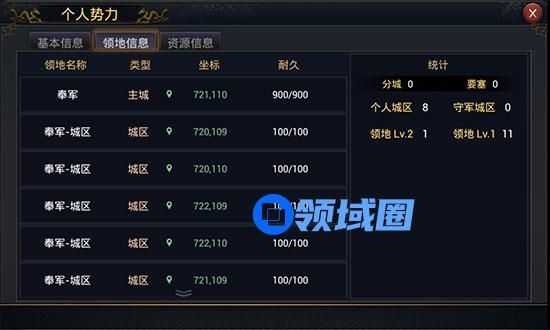 3)“领地信息”显示所有领地的类型、坐标、耐久、等级以及所占据的附属势力。分城、要塞、城区、各个等级的领地数目还会分别统计。