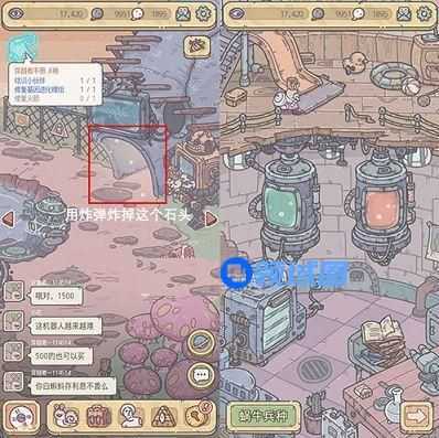此时可以看到自己的家园的显示屏下面有个石头,然后使用这个炸弹来把这个石头给爆破掉。