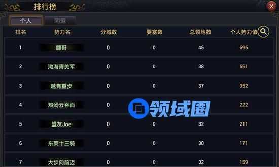 2)个人排行中可查看全服个人势力值前一百名的势力玩家及其分城数、要塞数、总领地数。个人排行依据玩家的势力值,玩家所占据的领地越高级并且数量越多,那么势力就越高,排名也就越靠前。