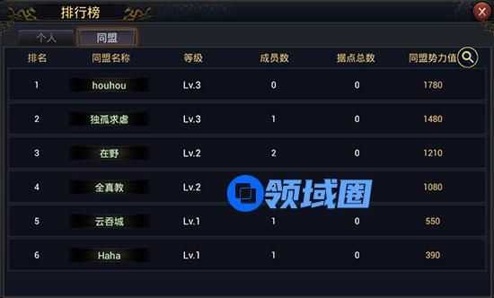 3)同盟排行中可查看全服同盟势力值前一百名的同盟及其等级、成员数、据点总数。同盟排行依据同盟等级和同盟势力值,通过捐献和战斗所得的同盟经验越多,同盟成员势力值和所占据的城池越多,那么同盟的排名就越靠前。