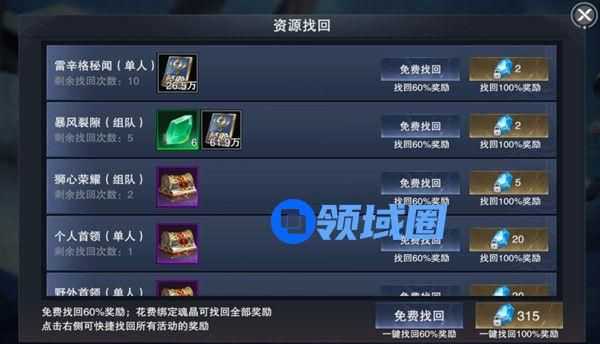 免费找回可以找回60%的奖励,使用绑定魂晶则可以找回所有的奖励。如果打不过狮心荣耀和个人副本,可以在第二天一键找回所有奖励,同样可以获得强力装备和珍惜材料。所以,前期打不过难度较高的副本也不用担心,一键找回资源就是了!