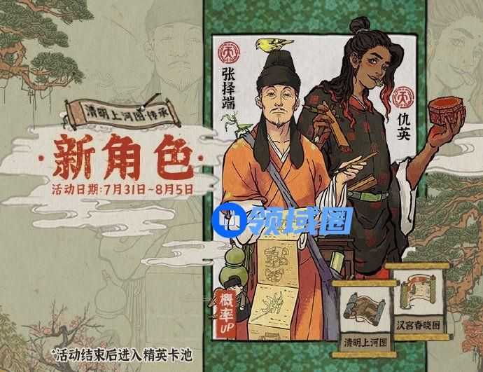 首先张择端、仇英这两个角色都天级,玩家们从7月31日开启就可以去上河这个卡池中抽取,而且此次活动还增加了新角色的活动几率,玩家们要是喜欢可以入手。