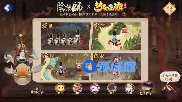 1.阴阳师大人可以在阴阳师内通过联动玩法,包括「捉鬼」、「宝图」、「运镖」和「封妖」来获取梦幻积分。