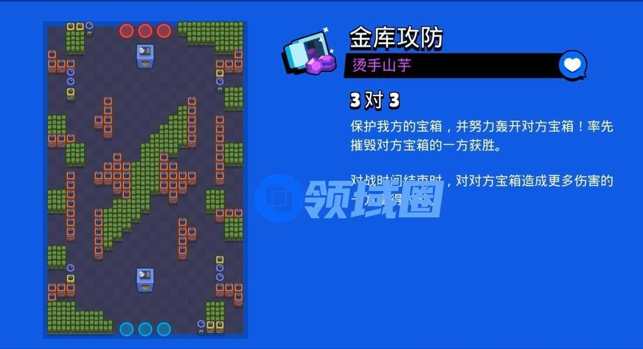 烫手山芋中间有一片斜向生长的草丛,各种墙体则并不连贯,划出了一条主干道和两侧的狭隘通道。对于金库攻防来说,地图的影响并不是很大,主要就是双方互偷伤害,谁伤害更高就更有优势。像瑞科、柯尔特、雪莉(草丛多的地图)、麦克斯、普里莫等英雄都是相当不错的选择,烫手山芋的障碍物连贯,因此巴利等投弹手也有更好的输出环境;格尔的妙具可快速弹跳到对方区域,基本上会成为金库必选英雄。