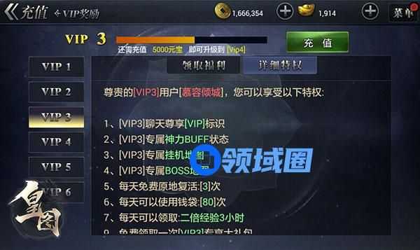 VIP会员系统是《皇图》手游玩家充值元宝后获得特权和奖励的福利系统。每一名玩家在游戏中充值,不仅获得相应的元宝,还可以享受到VIP特权,助您游戏更加轻松畅快、省时省力!
