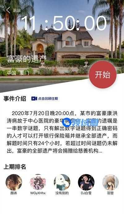 富豪将解密资料分成几份分给了自己的家人,截止至今日早8点,时间已经过去了12小时。但是由于富豪的子女们拒绝共同讨论解秘,故密码仍未解开,最终在母亲的劝说下,大家同意共享资料并平分所得遗产,因时间紧迫,特邀请各位侦探一起协助解密...