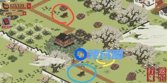 第一个钥匙宝箱边上的女娲神庙修好之后开这片区域。红圈是第一个宝物,黄圈是第二个钥匙,蓝圈是第二个宝物。(蓝圈宝箱前有棵梨树挡着,需要把梨树砍掉才能看见宝箱。所有区域都开的朋友请认准左下角三个桃树和一个梨树)