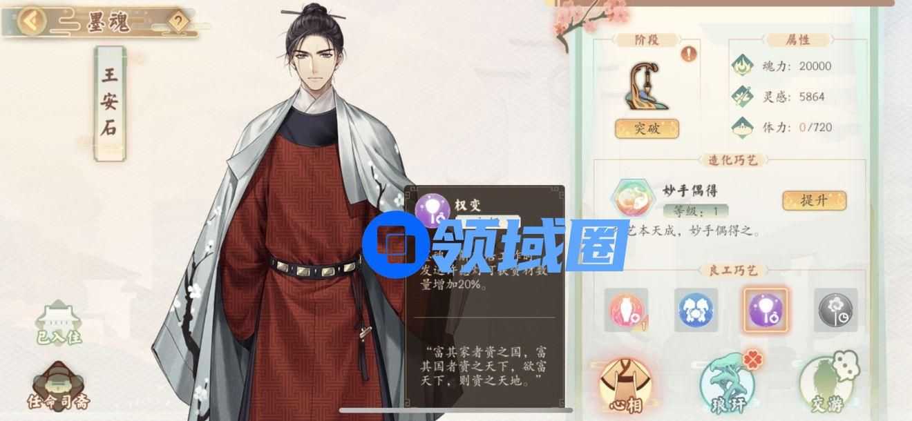 先推荐一个墨魂,开局四选一的王安石,jeff。推荐的原因是2阶段的介甫会多一个技能“权变”可以增加许愿20%的资材获取。资材现在真的是我非常稀缺的物资了,庄生梦魂快1K了,资材每天都用光。