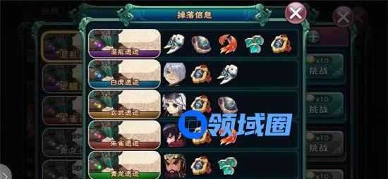 谷底遗迹产出最多的是圣兽材料,觉醒武将,除了主角,每个都需要,慢慢就捉襟见肘,这个时候就要多刷谷底遗迹,可以大量产出。混乱遗迹四个圣兽的材料都会掉落,每种的数量是相同的,其他圣兽专属遗迹掉落对应圣兽的单一材料。