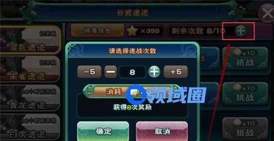副本的第一次都是只有挑战一个选项的,挑战通过之后挑战前面会显示连战选项,选择的是多少次连战,掉落的奖励就是单次的多少倍,感觉次数不够用的,可以点击上图加号位置,增加次数,这个地方的元宝花的绝对值。