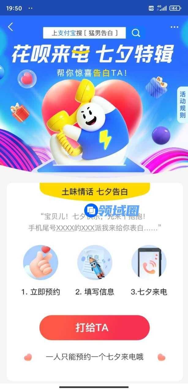 用户打开支付宝搜索:猛男告白,然后就可以看到“花呗来电 七夕电话替你告白”活动,直接点击打给TA,即可进入填写页面。