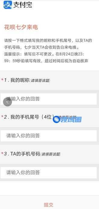 支付宝在2020年七夕节推出了全新的七夕节活动-花呗七夕来电,这个活动是花呗帮你告白,用户只需要输入自己的昵称和手机尾号,再输入要告白对象的手机号,在七夕节当天你的那个TA将会收到告白电话哦,是不是很好玩很惊喜?具体如何填写很多人不知道,小编来教你。