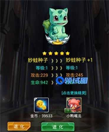 精灵进化:需要同星级精灵一个+金币,进化成功以后攻击和生命值都会增加。