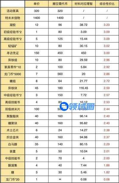 推荐兑换的材料性价比排序如下:凝胶、初级经验书、高级经验书、轻锰矿、寻访凭证、异铁组、(家具零件)、龙门币*5000、糖组、异铁块、中级经验书、高级技能书、双极纳米片、聚酸脂块、糖聚块、术士芯片、炽合金块、白马醇、装置、中级技能书、酮凝集、糖。大家依照上表顺序兑换即可,也可以根据自己的需要进行调整。