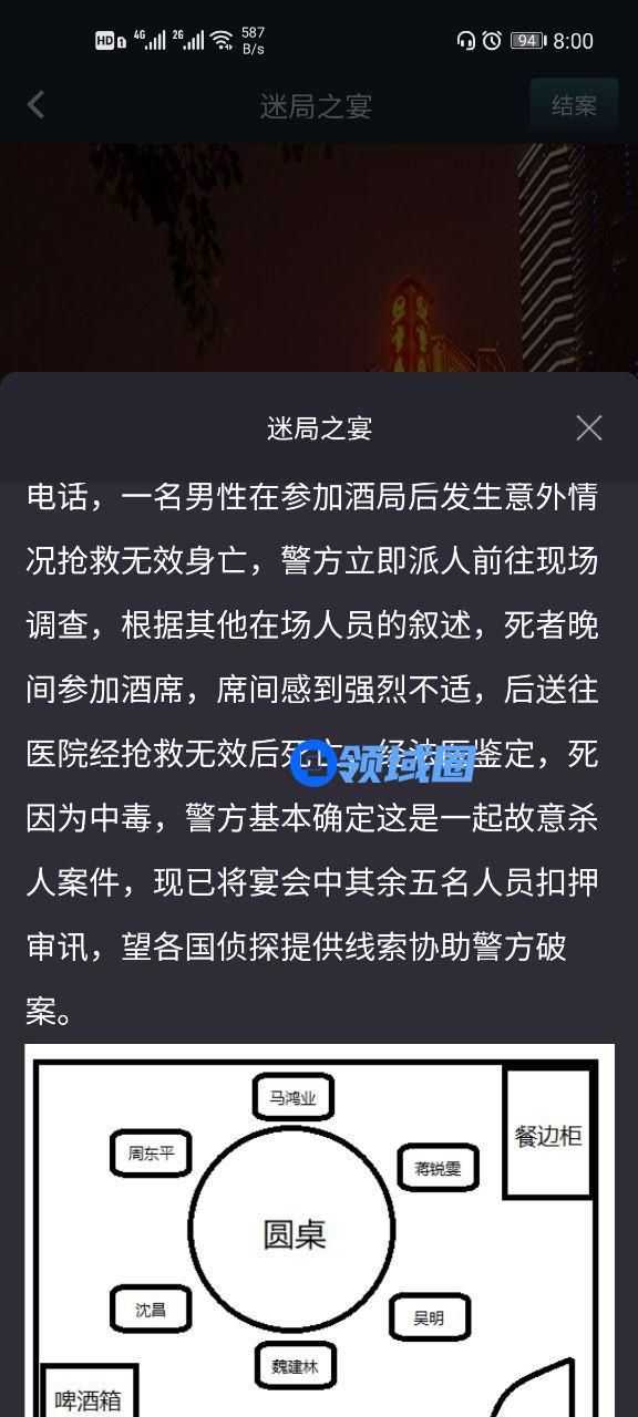 2020年8月28日23:40,市公安局接到报警电话,一名男性在参加酒局后发生意外情况抢救无效身亡,警方立即派人前往现场调查,根据其他在场人员的叙述,死者晚间参加酒席,席间感到强烈不适,后送往医院经抢救无效后死亡,经法医鉴定,死因为中毒,警方基本确定这是一起故意杀人案件,现已将宴会中其余五名人员扣押审讯,望各国侦探提供线索协助警方破案。