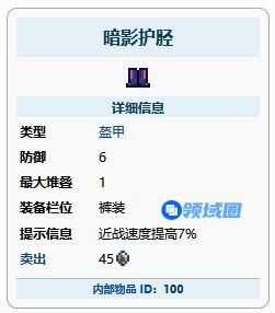 在游戏《泰拉瑞亚》中,暗影护胫是使用15个暗影鳞片和20个魔矿锭在铅砧或者铁砧上可以制作获得的,这件装备的防御值是6点,使用后可以增加7%的近战攻击速度,出售后可以获得45银。