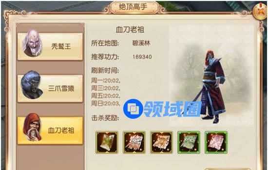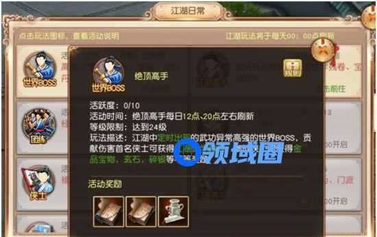 在门派场景刷新,所有玩家都可以参与。根据伤害排名,分5档:第1名,前5名,前10名,前20名,20名后,对应不同的奖励。奖励主要为各种武学残卷。