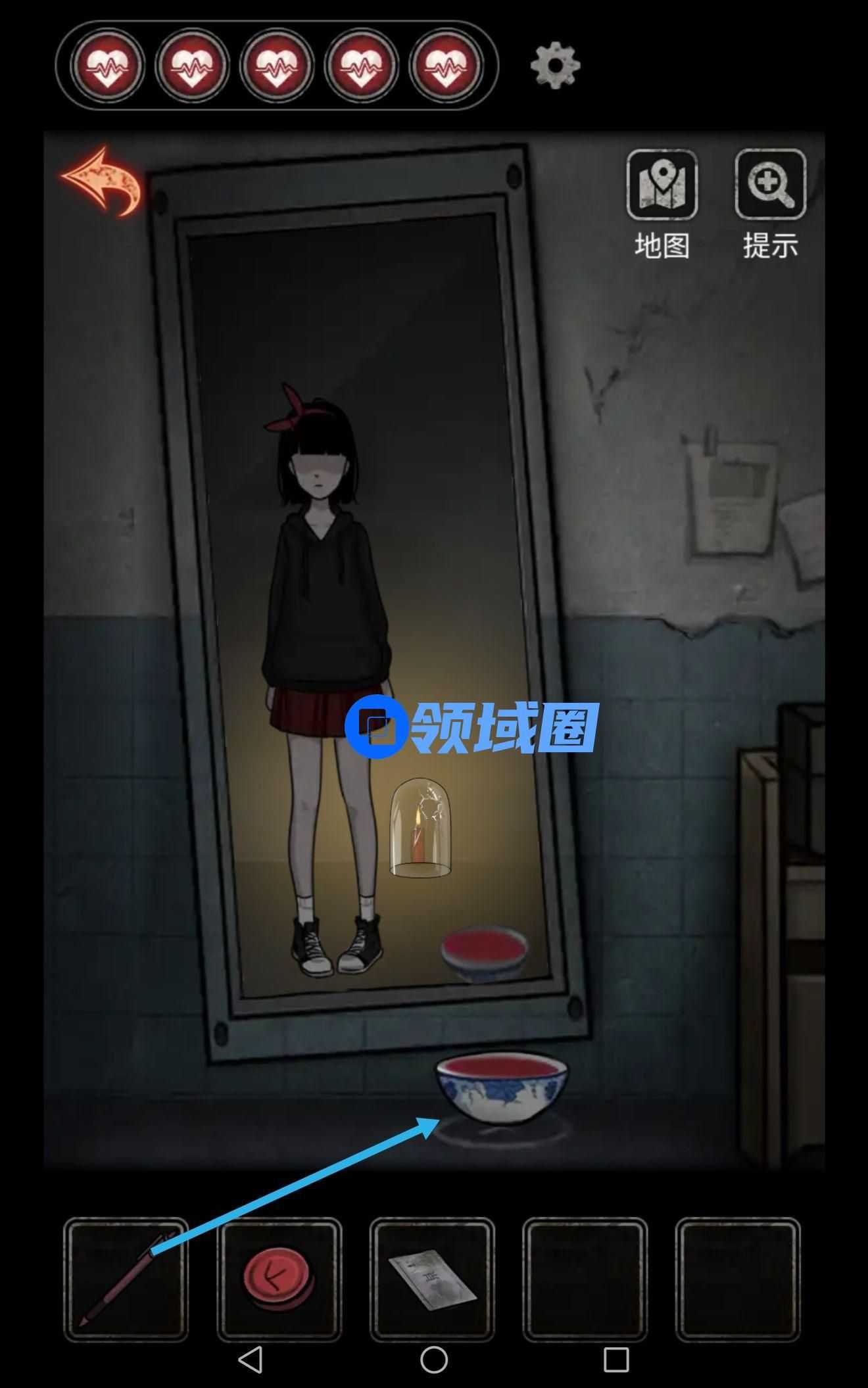 打火机点燃镜子前的蜡烛,罩子用上。碗放镜子前地上,倒墨水,用笔敲。
