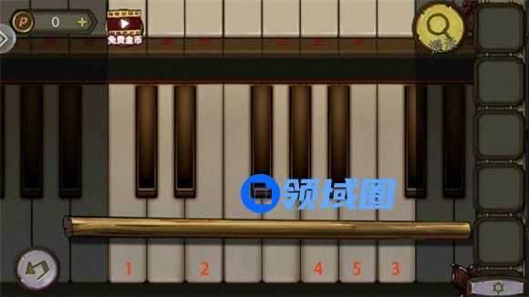 4、钥匙打开钢琴,按下所有琴键,拿到木棍。木棍拿吊灯上的信封,信封里拿到唱片。钢琴解法:如下第二张图。