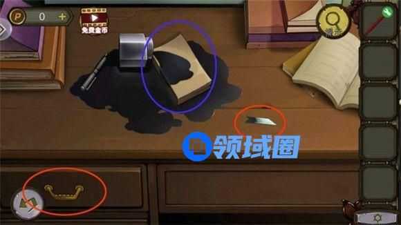 16、根据墙画上的英文和纸条上的颜色,打开柜子拿到圆片,桌上拿到铅笔。圆片打开右卧的盒子,拿到半块宝石。