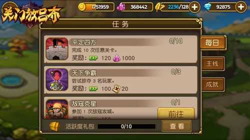 主城或者城外的大地图都可进入到任务界面。任务分为三个种类,分别是每日任务、主线任务和成就任务。其中每日任务每天都会重置,而主线任务和成就任务不会更新,因此,每天完成日常任务是获取资源的重要手段!