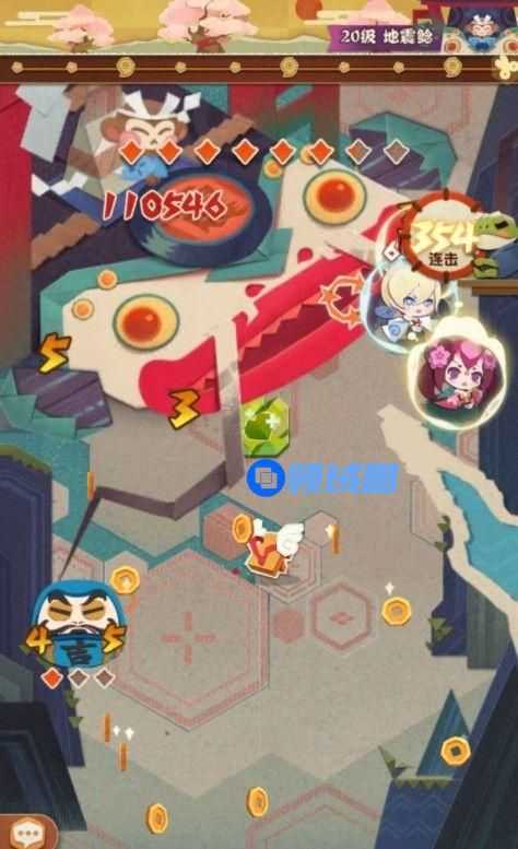 3.大天狗和椒图除了前期配合清掉小怪之外,利用其贯穿属性,可以在右边柱子消失时行动而不触碰回血石头,桃花和小天狗一定在有柱子时行动。