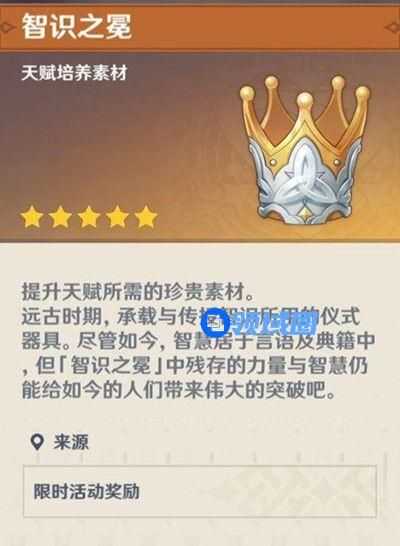通过1.1测试版游戏中智识之冕的图鉴来看,目前原神手游中智识之冕是【最顶级的天赋培养素材】,也就是角色天赋技能等级从9升级到10级的必需品。而智识之冕的获取途径也仅有一种,那就是限时活动了。