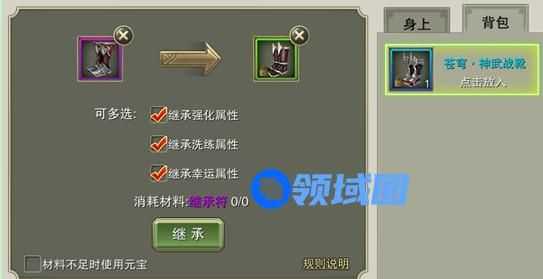 1、继承可将旧装备的强化属性、洗炼属性、幸运属性传承到新装备上。传承属性100%继承。
