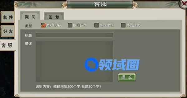 玩家可以在客服界面向客服提交游戏中遇到的BUG、建议等。并且可以收到客服的即时回复。