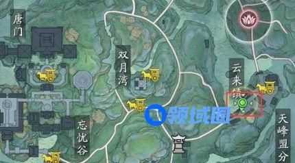 咒哥的位置其实非常容易找到,就是玩家来到巴蜀,然后在如图所示的地方,也就是云来镇这里,就可以看到这个咒哥了,虽然名字有个哥,但是其实她是女的NPC。与之对话即可顺利的完成。