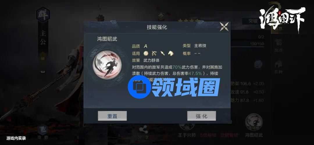 主将技·鸿图昭武:一级效果为对范围内的敌军造成70%武力伤害,并对其施加“溃散”(持续武力伤害,总伤害率47.5%),持续20秒。