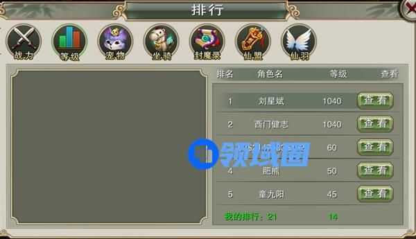 1、排行榜分为战力、等级、宠物、坐骑、封魔录、仙盟、仙羽这7种。