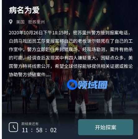 2020年10月26日下午18:15时,密苏里州警方接到报案电话,白鸽马戏团员工莎夏报案称自己的老板谢尔顿死在了自己的工作室中,警方立即赶往并封锁现场,经现场勘测,案件有他杀的可能,经调查后发现其中有四人嫌疑重大,因疑点众多,美国警方特将线索公开, 以上就是犯罪大师病名为爱的答案,大家可以参考一下。