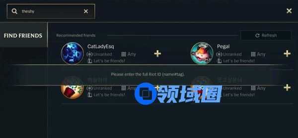 在搜寻并添加好友的时候可以看到提示,要求玩家输入的是对方的完整的Riot ID,也就是需要名称加上后面的Tag。