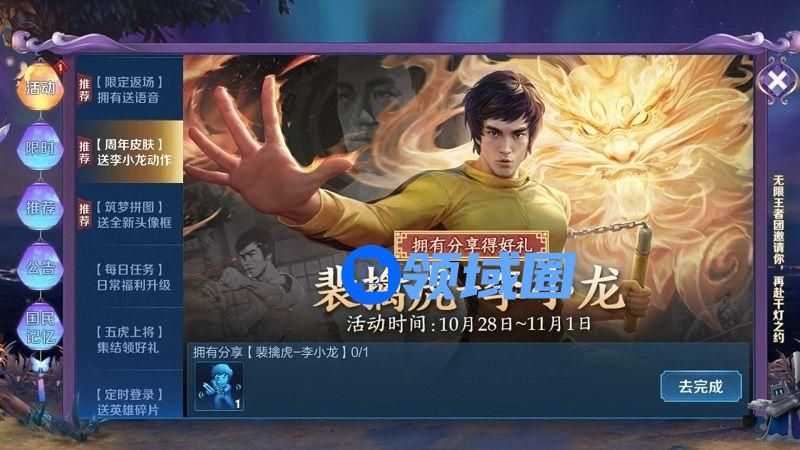 10月28日-11月4日期间,在活动列表可找到【李小龙皮肤-分享得好礼】活动,在拥有李小龙皮肤的情况下,分享给QQ好友或者到空间里去,就能免费领取武道·战动作。