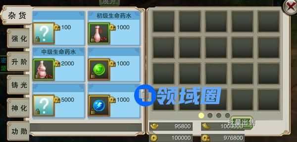 2、商店内出售的道具分为药品、强化石、升阶石、铸光卷轴以及神化卷轴。除药品可直接使用铜钱购买外,其他道具需要使用低级道具兑换,如消耗低级强化石换取中级强化石。