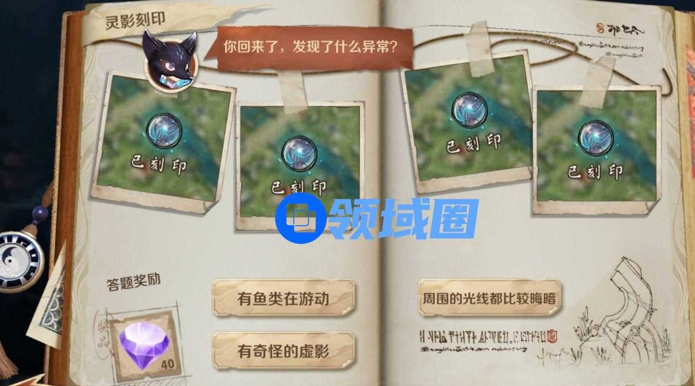 回答之后的奖励是40钻石,小编选的有奇怪的虚影,至于其他的,你可以自己来尝试下,是不是也给钻石,其实肯定能过这个任务的,至于选什么应该不是很重要。