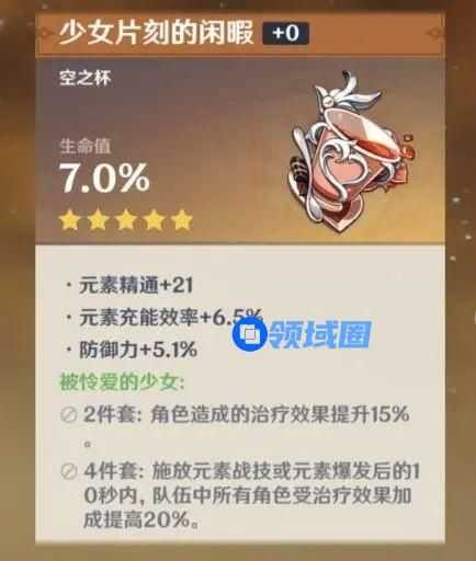 主要用于强化迪奥娜在释放元素爆发后对其他角色的治疗效果,本质上时作为一个辅助套装来用,也可以选择搭配两件套来单纯触发治疗加成效果,剩下三件选择更适合的组件。