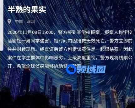 2020年11月09日19:00,警方接到某学校报案,报案人称学校话剧社一男同学遇害,短时间内因抢救无效死亡。警方立即前往并封锁现场。经查证后警方判定该案件是一起谋杀案。因此案件在学生群体中影响恶劣,上级高度重视,警方现将线索公开, 以上就是犯罪大师半熟的果实答案。
