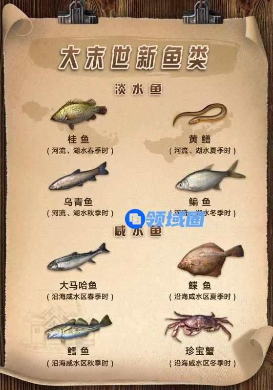 总共新增8种鱼类和4种果蔬,下面也为幸存者们整理了不同季节对应的食材和鱼类,又可以大展身手发挥厨艺啦。