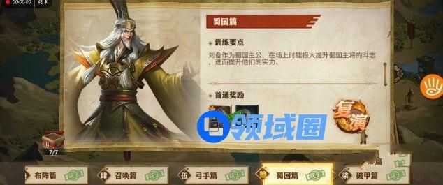 游戏中的演武场是属于游戏中的教学关卡,考验的是玩家对武将技能、兵种、站位的运用,而蜀国篇中所考验的就是武将的搭配和站位的选择了: