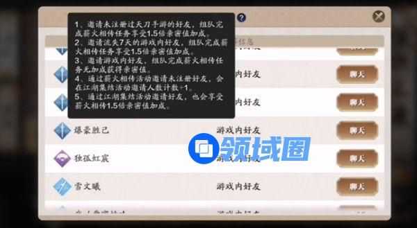 薪火相传是天涯明月刀手游中最近开启的一项活动,玩家们可以邀请亲密好友达成至亲好友关系,并可以通过若干任务来获得亲密值的加成。