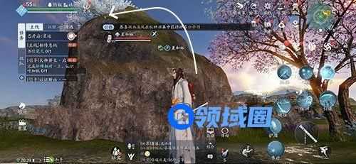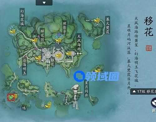 这个传音蛊的位置,就是在移花的左下角,就是霞光流鸣这个地方,玩家可以来到红框这个区域。