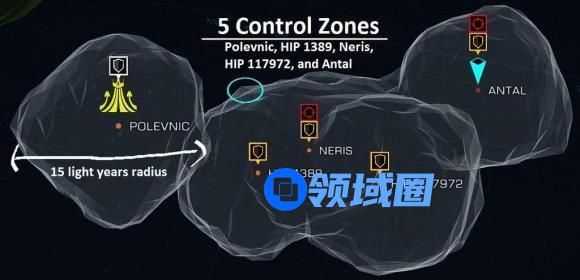 打开galxy map 势力视图,将鼠标移动到星系上可以看到以该星系为圆心半径为15光年的圆,这便是一个控制区域。每个星系在该圆的范围内都属于该势力。而我们要做的便是选择一个扩张星系实现1-3的阶段任务,进而达到扩张势力的目的。