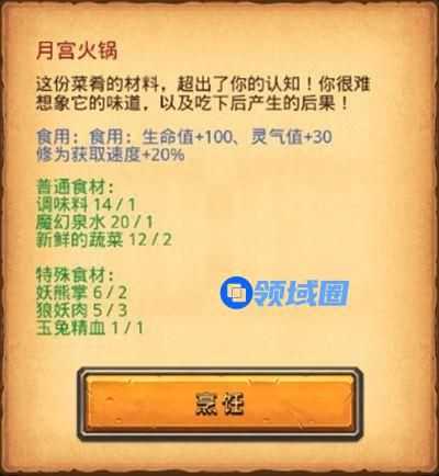 烹饪菜品月宫火锅需要的食材包括了调味料、魔幻泉水、新鲜的蔬菜、妖熊掌、狼妖肉、玉兔精血。