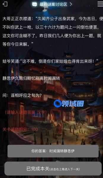 最后一句将前后联起,首尾呼应,所以答案为时闻漏转静思伊。
