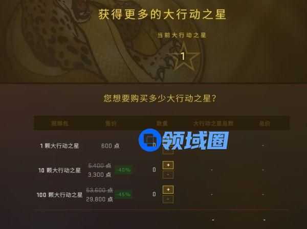 做任务可得大行动之星,每周获取的大行动之星有上限。如果没有时间做任务,你也可以购买大行动之星升级包。购买并激活后,可以获得1/10/100个大行动之星,并拿到相应奖励,但不会影响行动币等级。