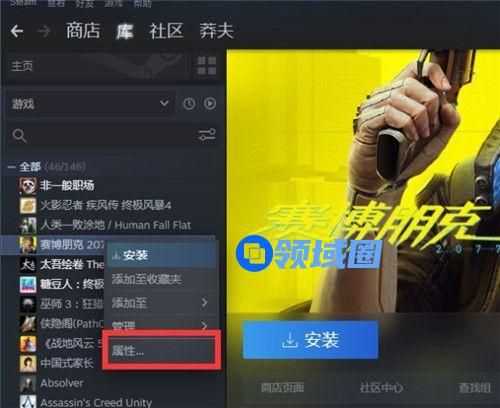 1、首先打开steam,在赛博朋克旁边点击右键属性;